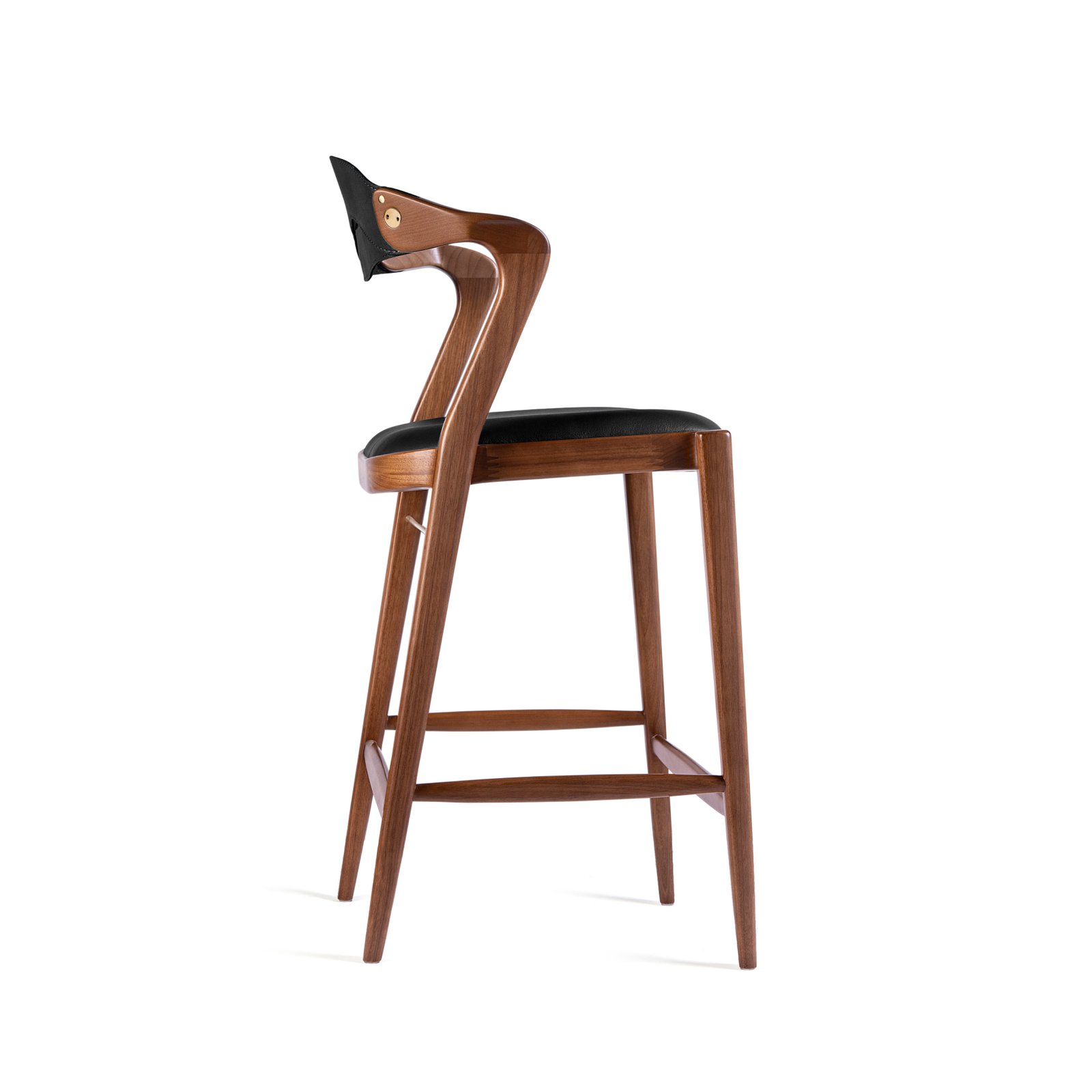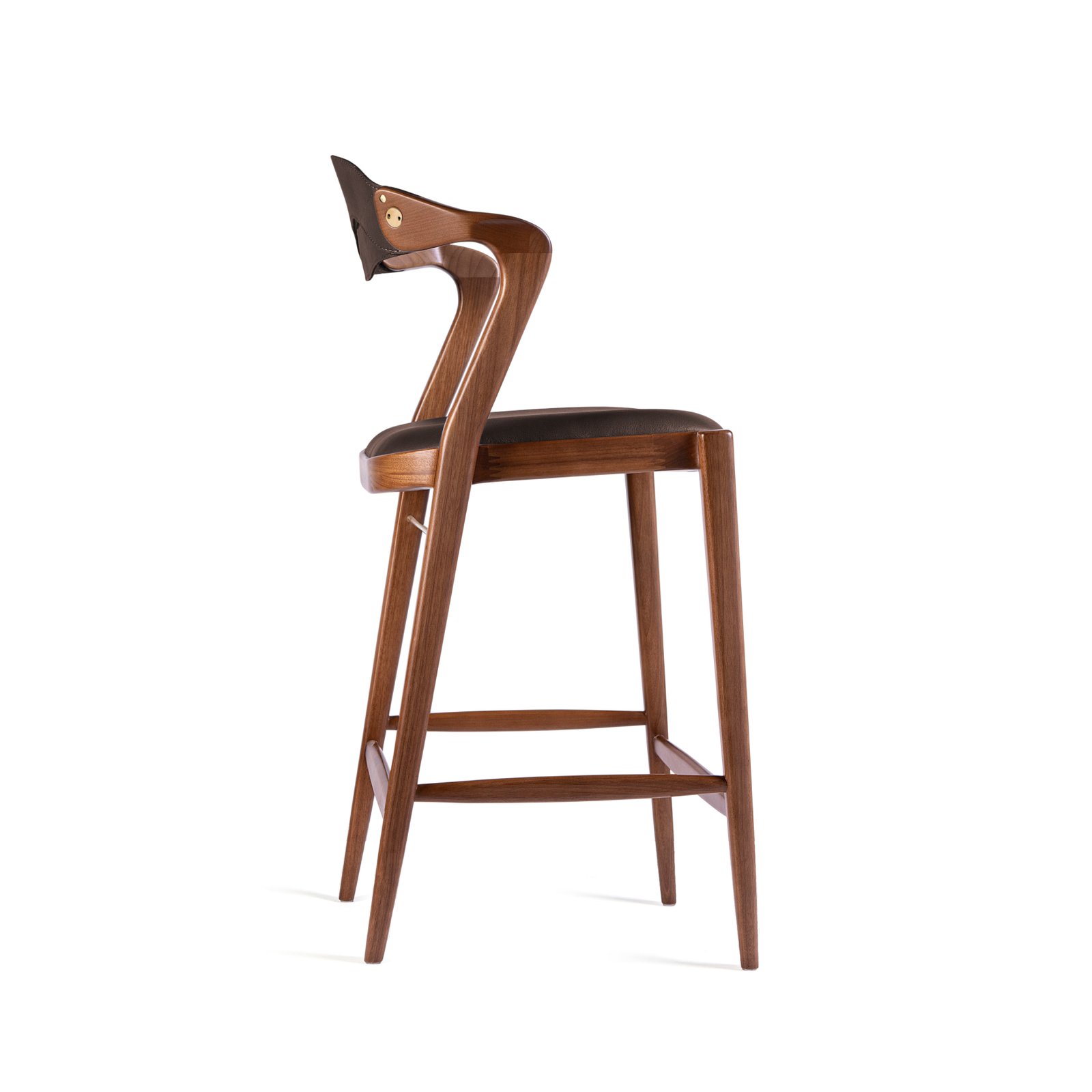 The Angela Stool stands out for two spectacular features. First, its mixed-media styling brings a wholly fresh trifecta of rich wood, firm, but smooth leather, and unexpected metallic accents. It exudes a luxurious lifestyle. Second, it has an ineffable way of fitting–with great comfort and surprising stability–to all different types, sizes, and angles of its occupant. Its arms were styled after the popular Duda; just enough to rest the elbow, but not too long, to enable the sitter to swing easily in and out of the seat.