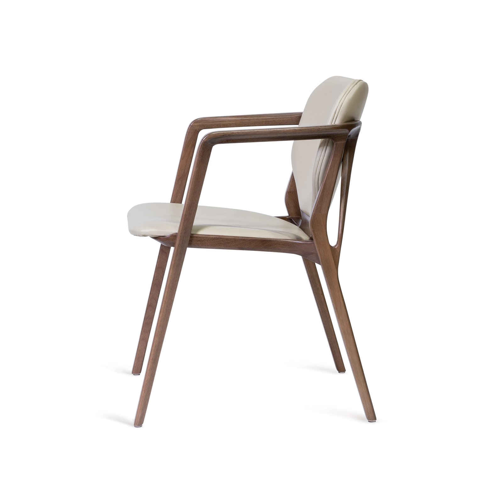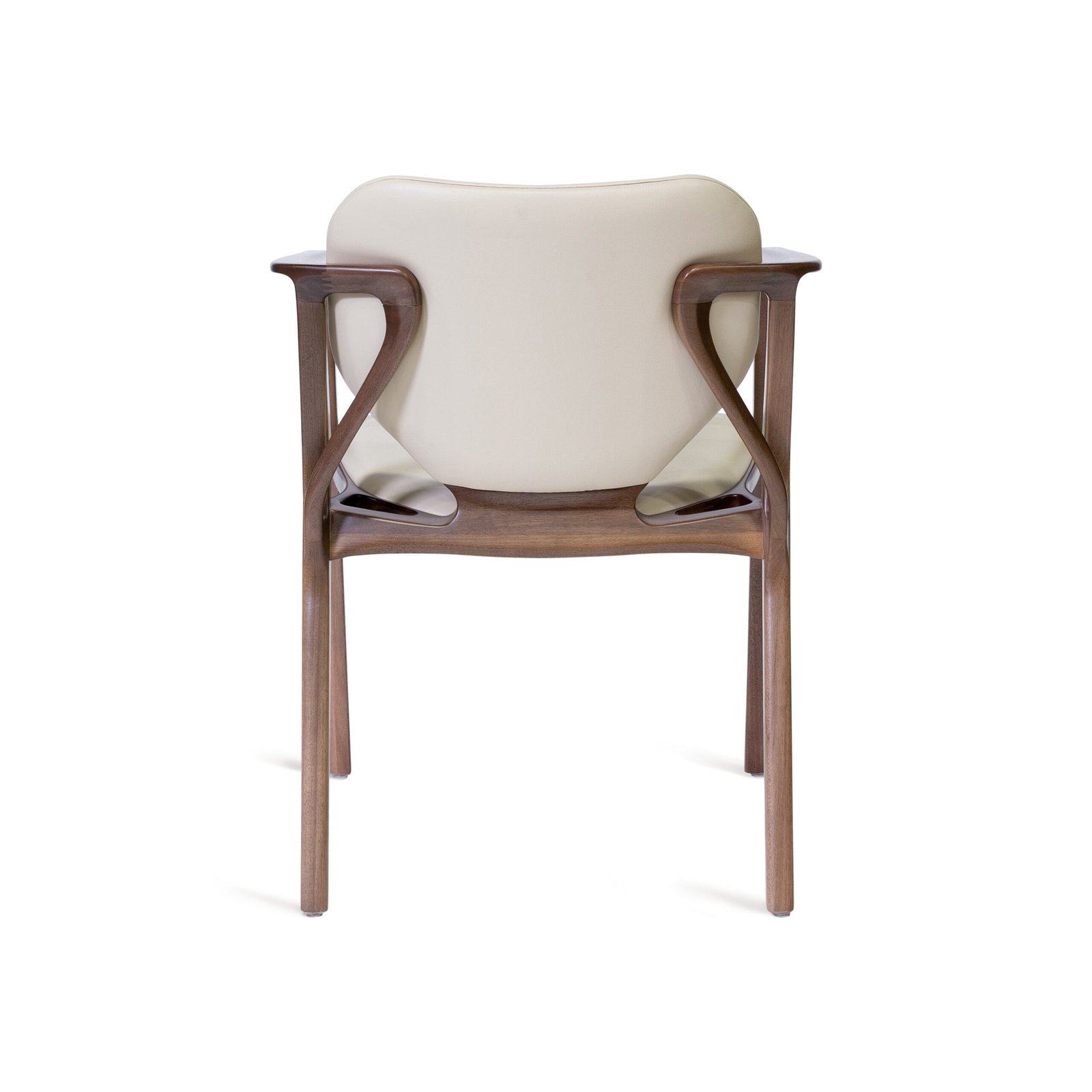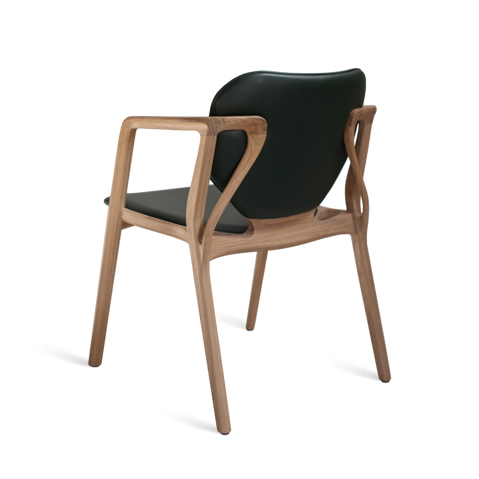 An enormous leaf rooted in the bucolic grounds of his manufacturing facility inspired the intriguing back lines of the Karla Armchair. Named for the first crush of his youth, Karla the woman is determined and focused. Visually delicate, the chair is superior in strength. Like Karla.